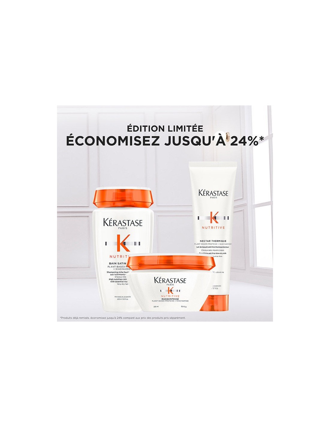 Coffret cadeau Nutritive de Kérastase en édition limité composé de : shampooing, masque et protecteur thermique pour prendre soin des cheveux secs à très secs