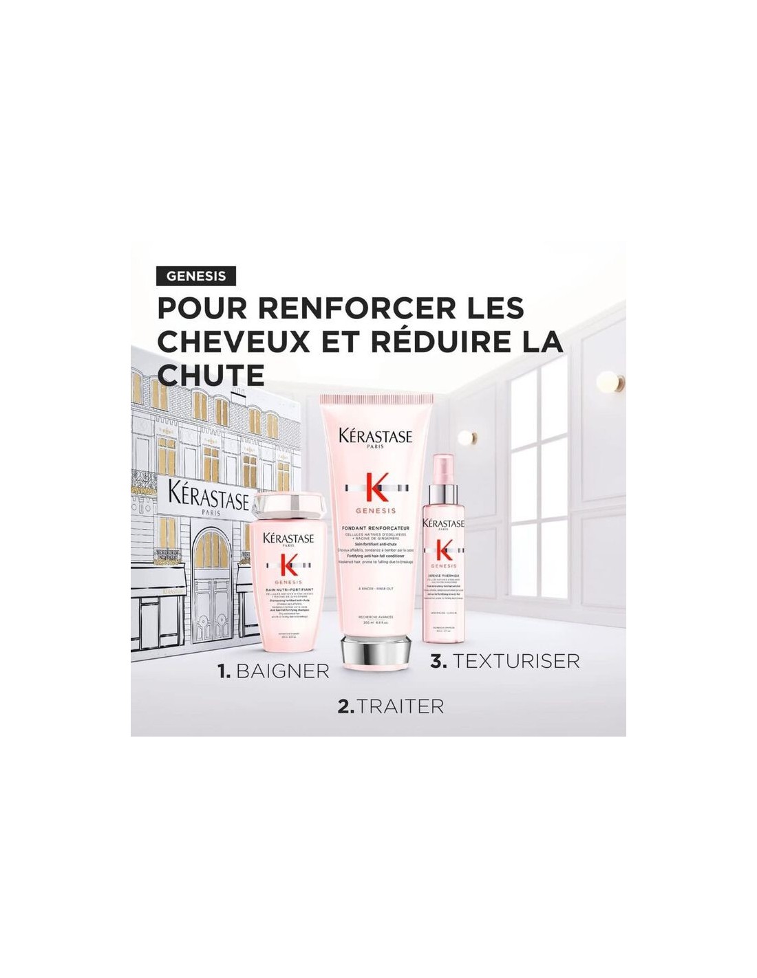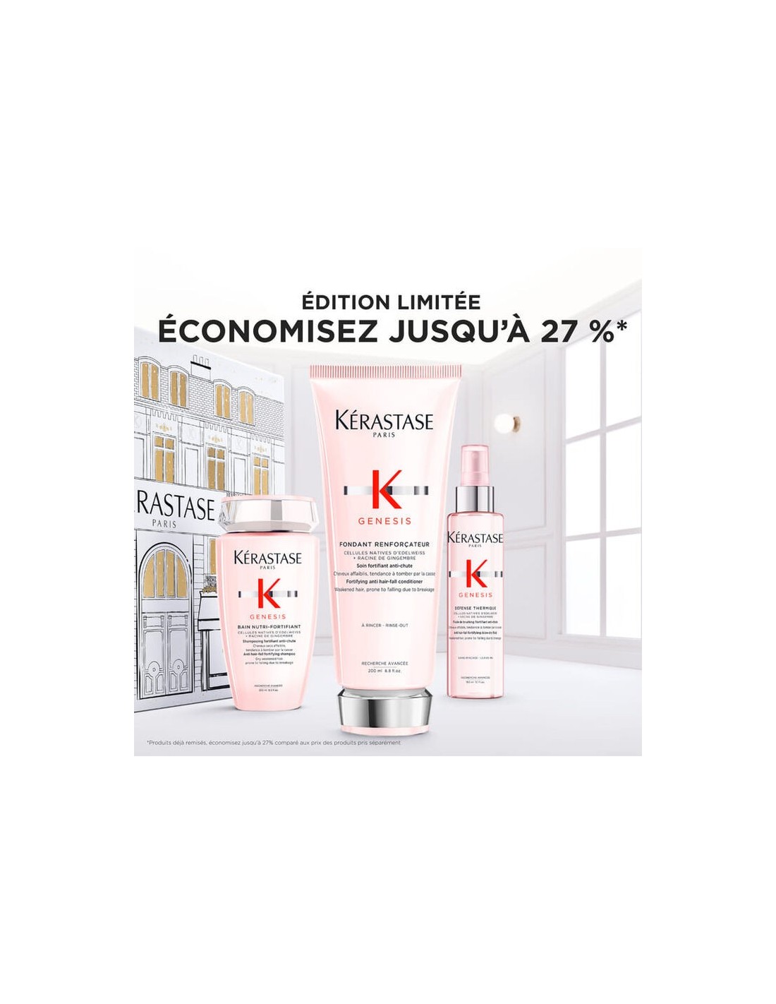 Coffret Cadeau Genesis de Kerastase en édition limitée composé de trois soins iconiques de la gamme : le Bain Hydra-Fortifiant, le Fondant Renforçateur et le Fluide Défense Thermique