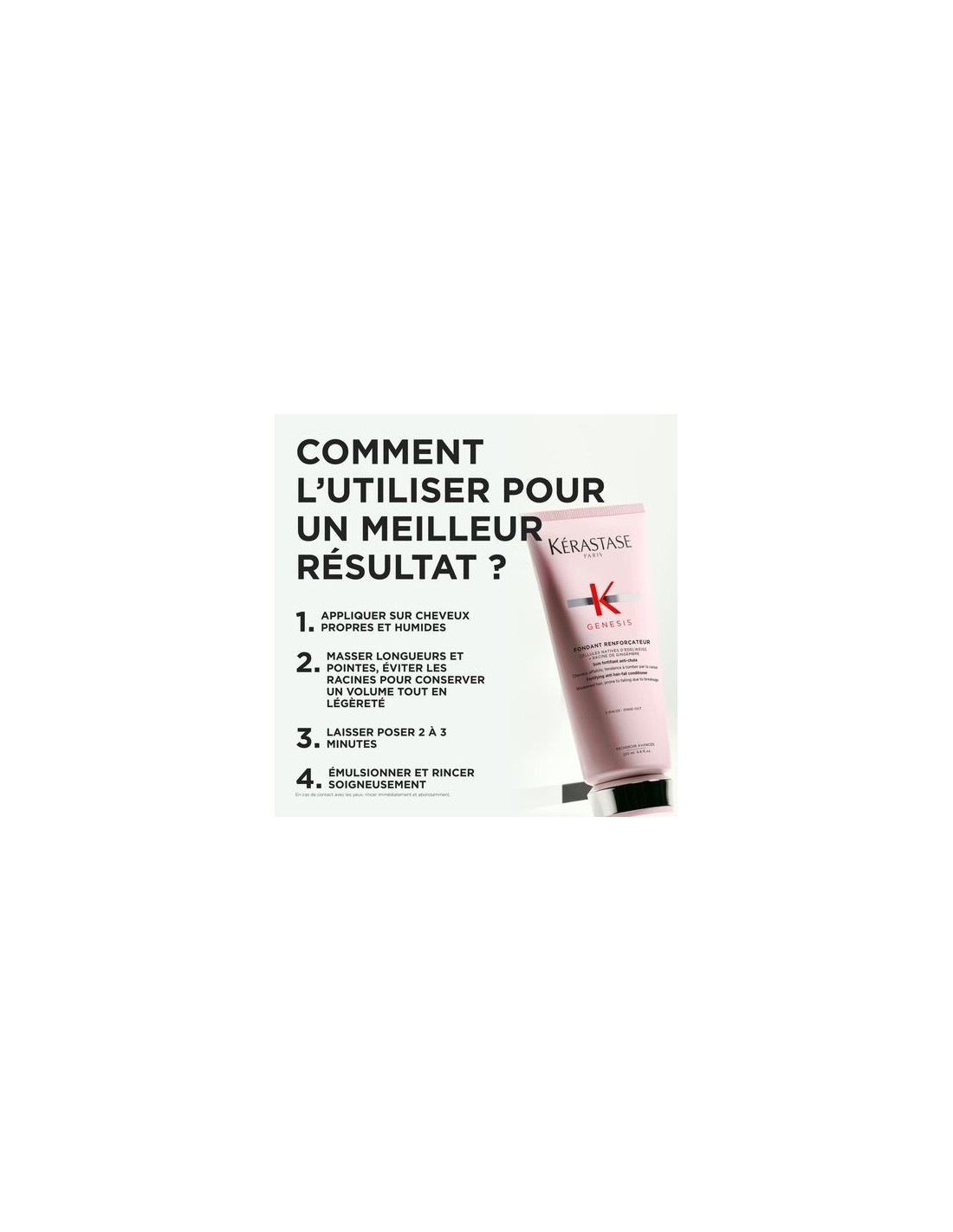 Sans silicone. Sans sulfate. Action anti-casse et renforcement de la fibre. Léger. Renforce et adoucit en un instant. Hydrate et fait briller. Démêle et apporte de la masse. Réduit la chute de cheveux due à la casse durant le brossage de 97 %*.